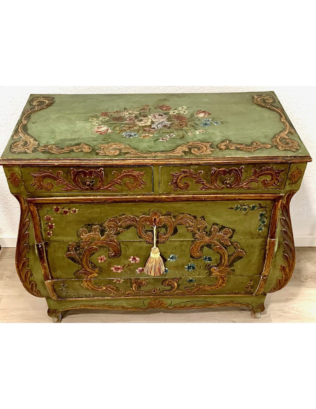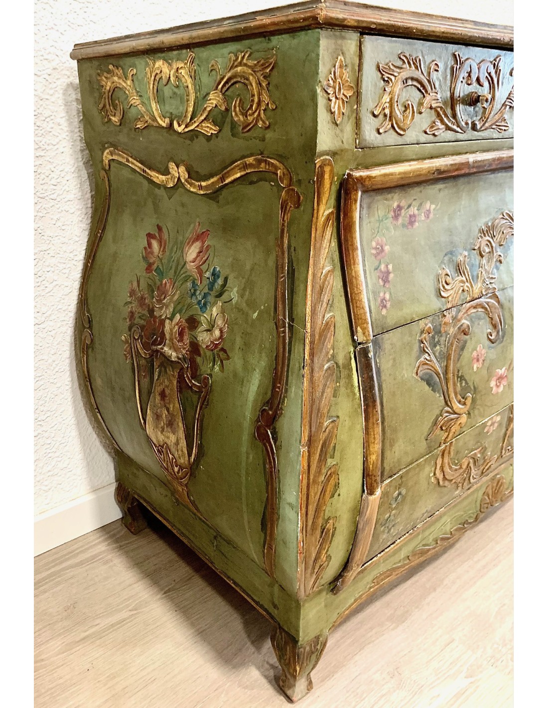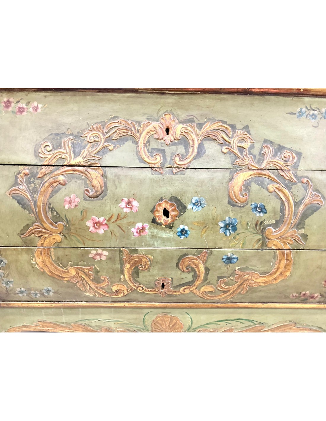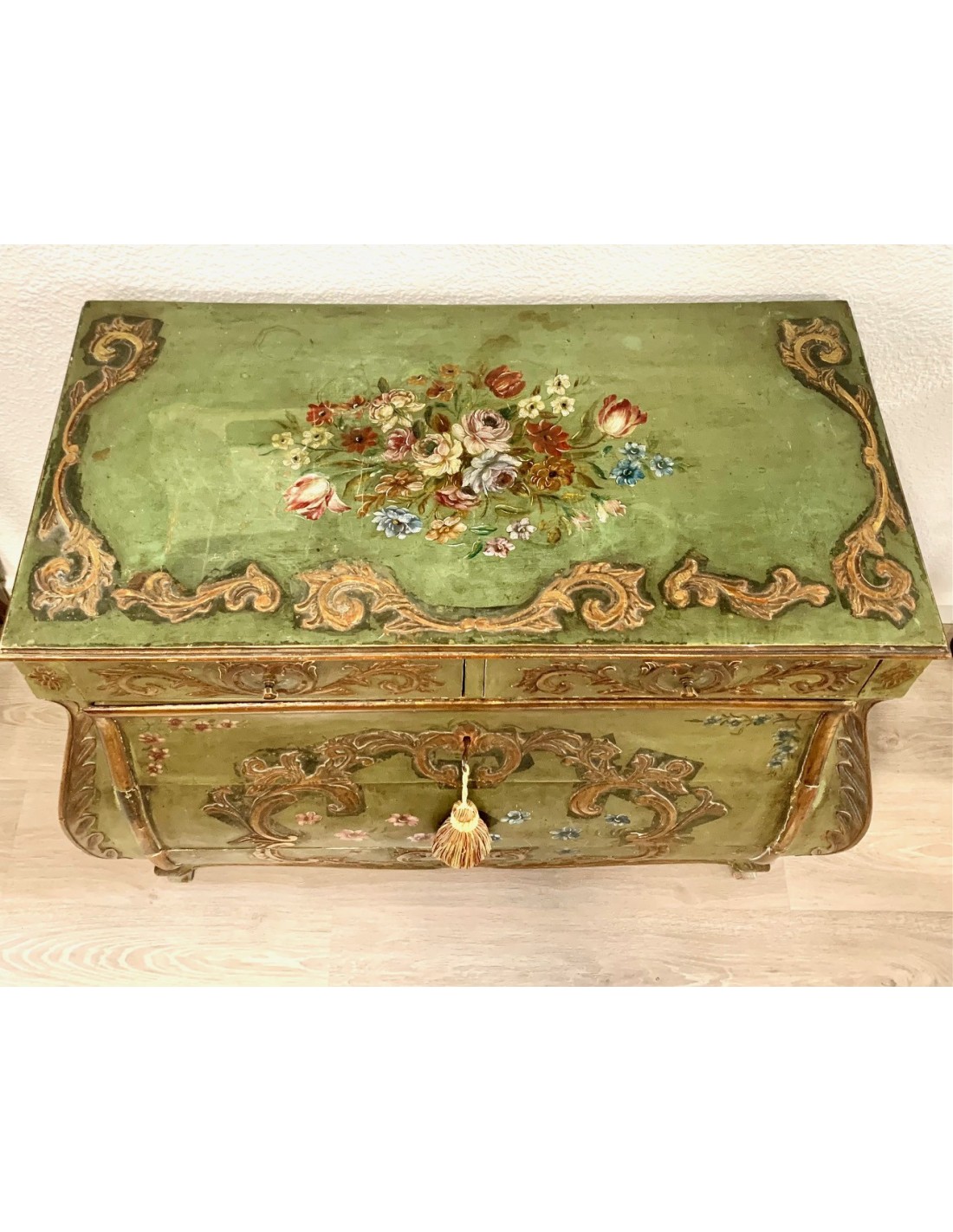 Comó del XIX secolo bombato e laccato con fondo verde, con decorazioni policromate floreali nel piano superiore e i due laterali, lesene in basso rilievo dorate. Due cassetti superiori, tre piú grandi nella parte inferiore. Buono stato di conservazione.