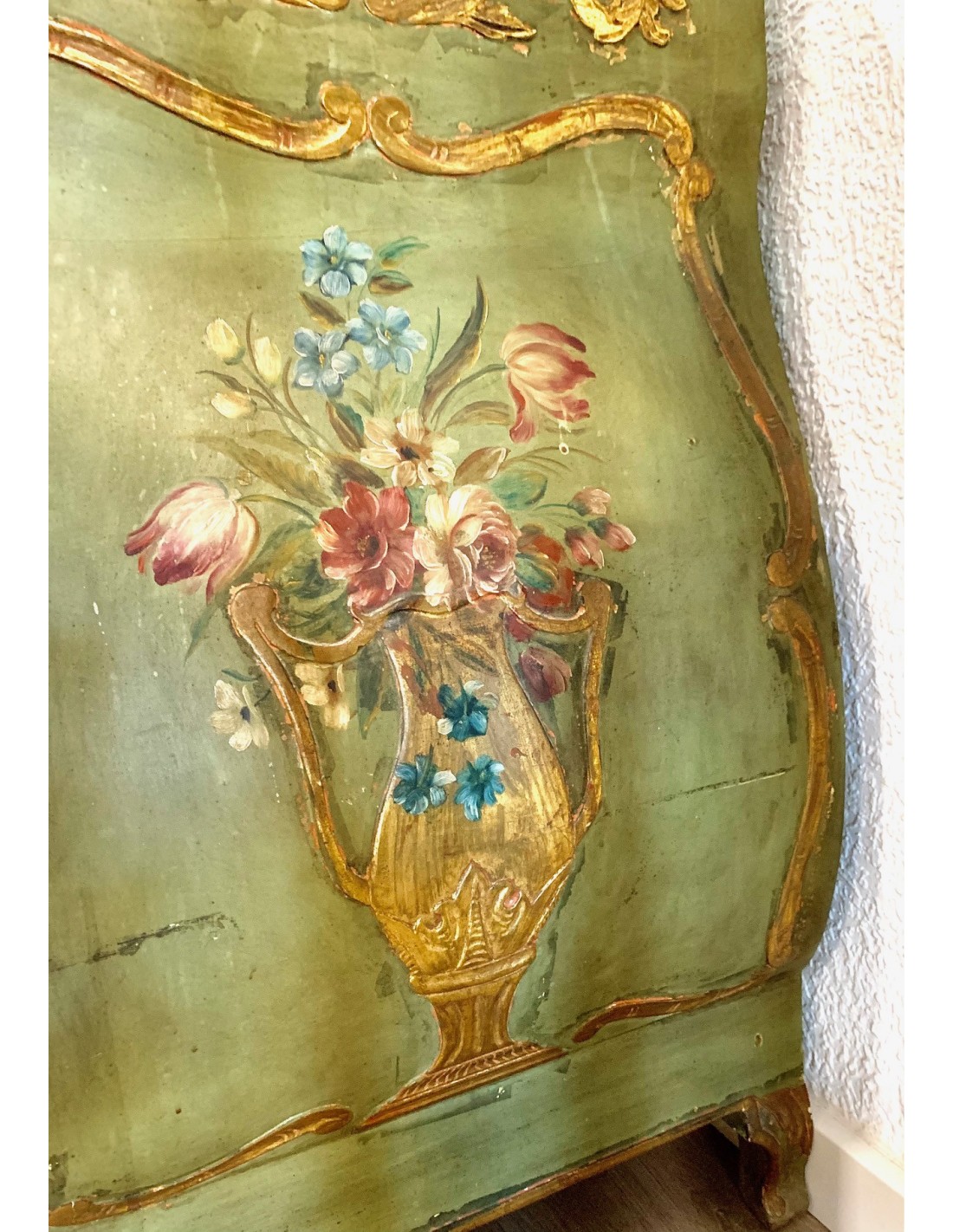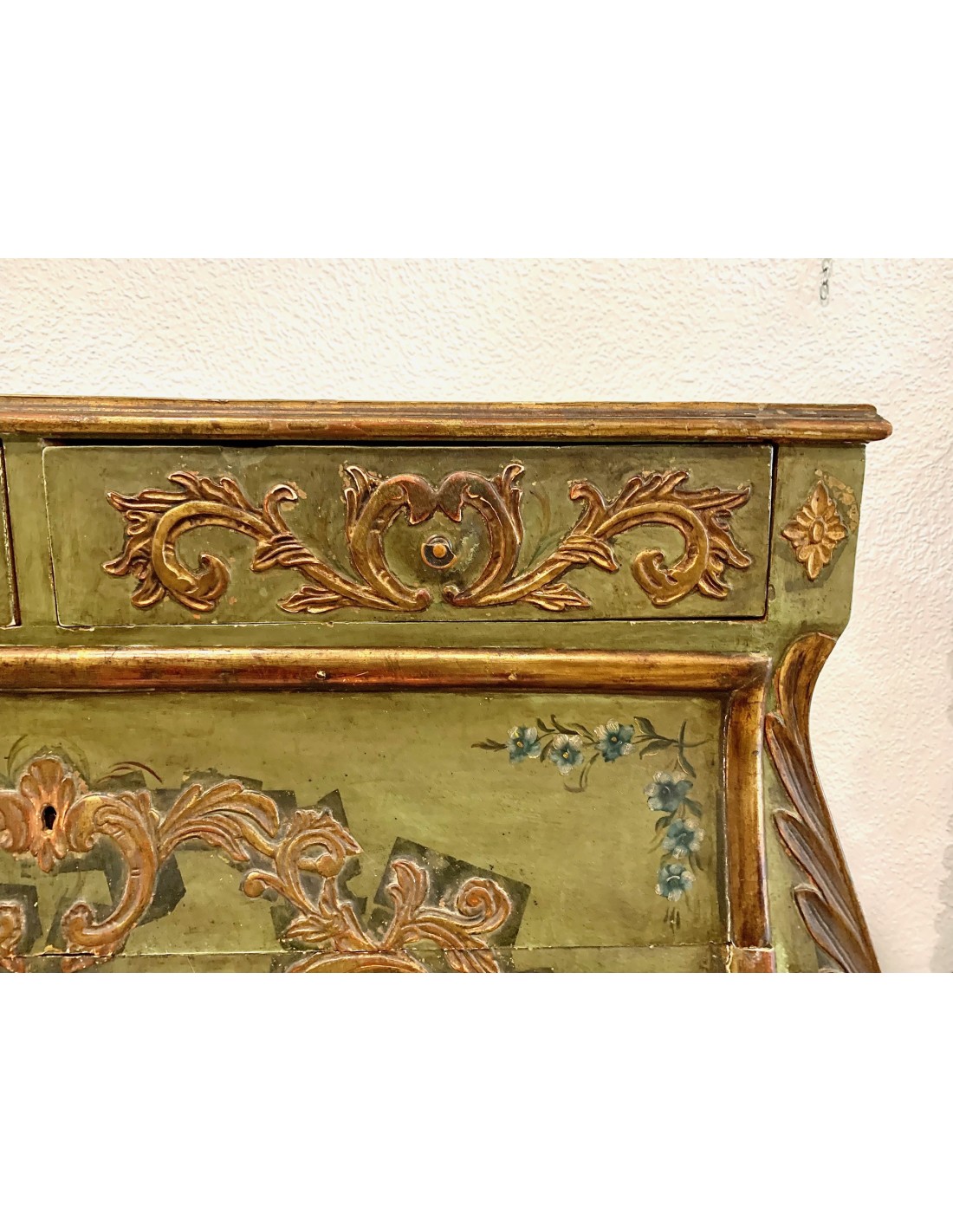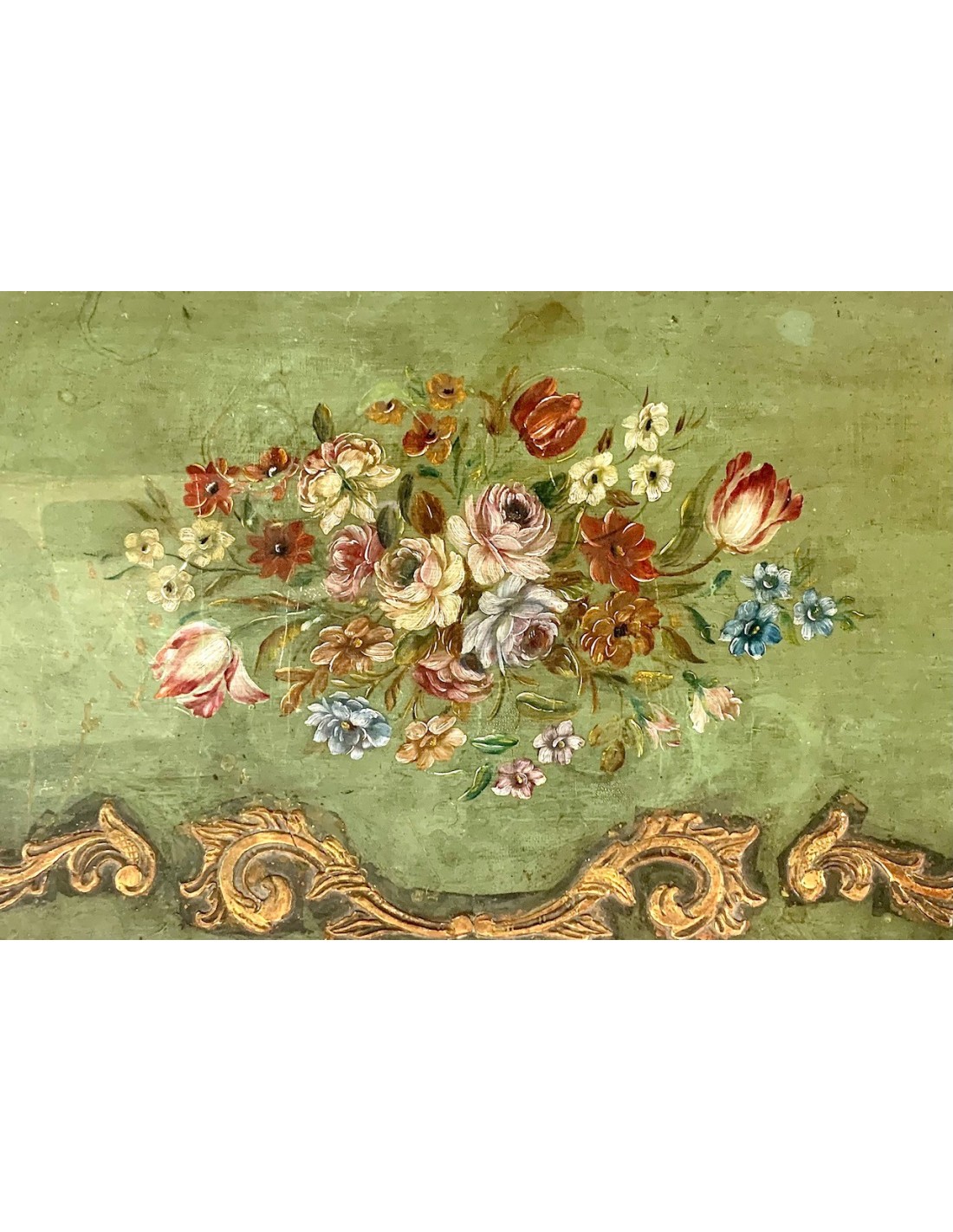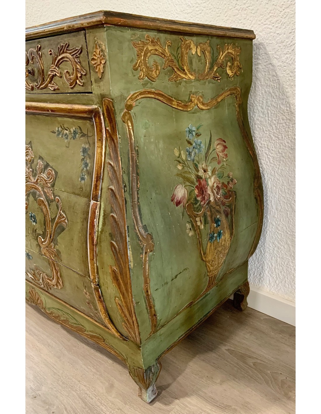 Comó del XIX secolo bombato e laccato con fondo verde, con decorazioni policromate floreali nel piano superiore e i due laterali, lesene in basso rilievo dorate. Due cassetti superiori, tre piú grandi nella parte inferiore. Buono stato di conservazione.